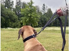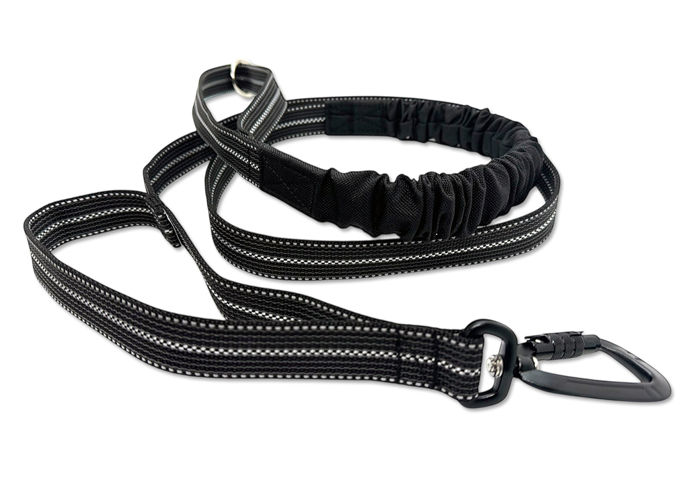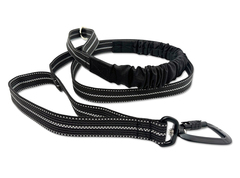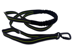 Een zachte en flexibele riem met een ingenaaid bungeestuk om de trekkracht van de hond te verlichten. De riem is voorzien van reflecterende tape en rubberen draden, wat zorgt voor een uitstekende grip. Aan de onderkant, bij de hond, bevindt zich een extra handgreep voor extra controle indien nodig.